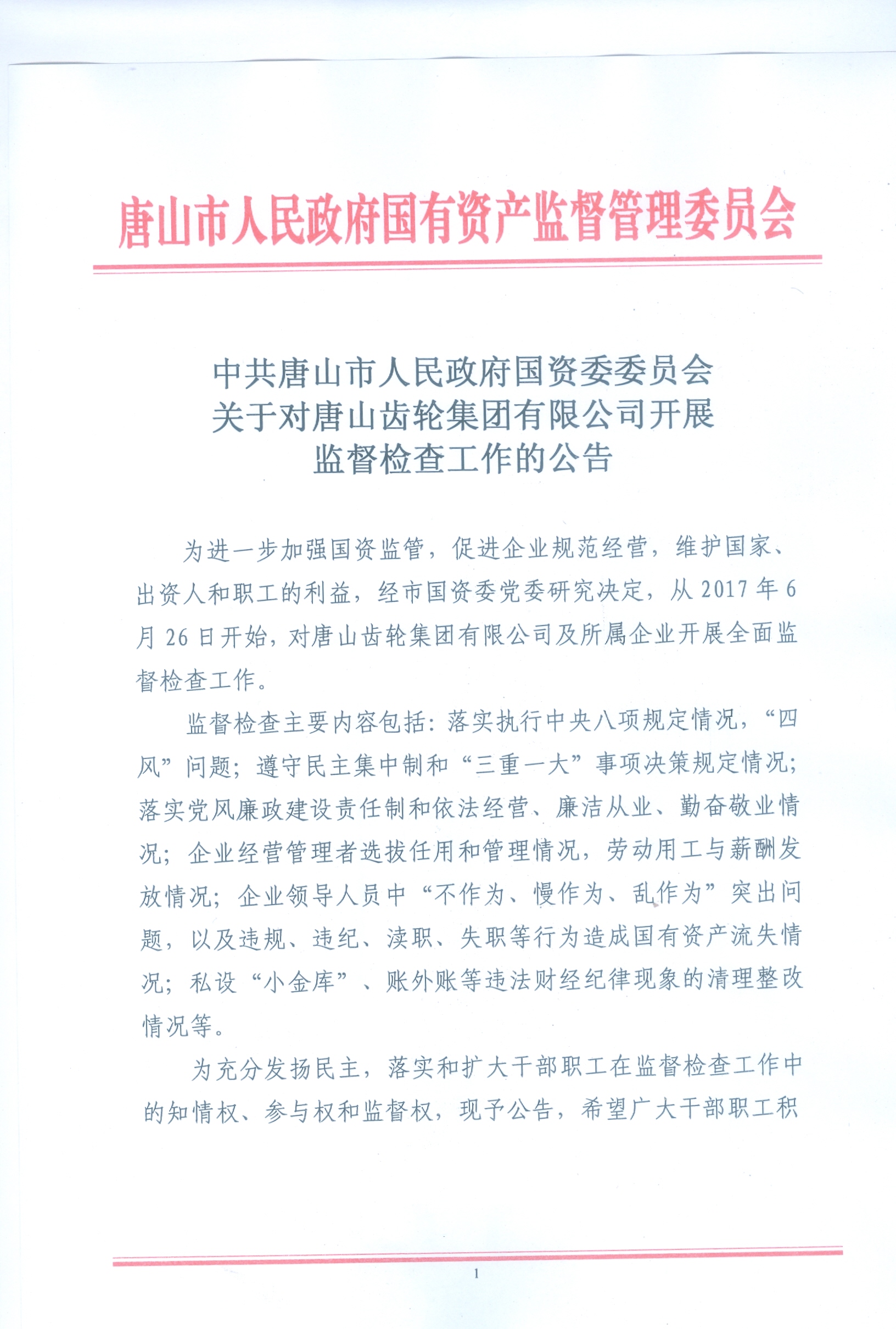 2017年6月26日开始,国资委监督检查小组对集团公司及所属企业开展全面监督检查工作,现将国资委党委监督检查公告发给大家。