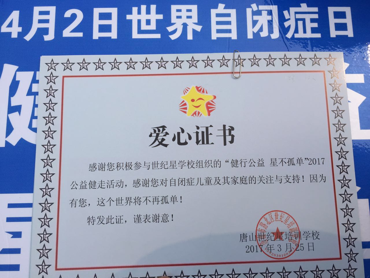 对于参与者的爱心行为,主办单位的自闭症儿童教师们用手语“感恩的心”将一张张爱心证书,送到了每一位有爱的队员手中。