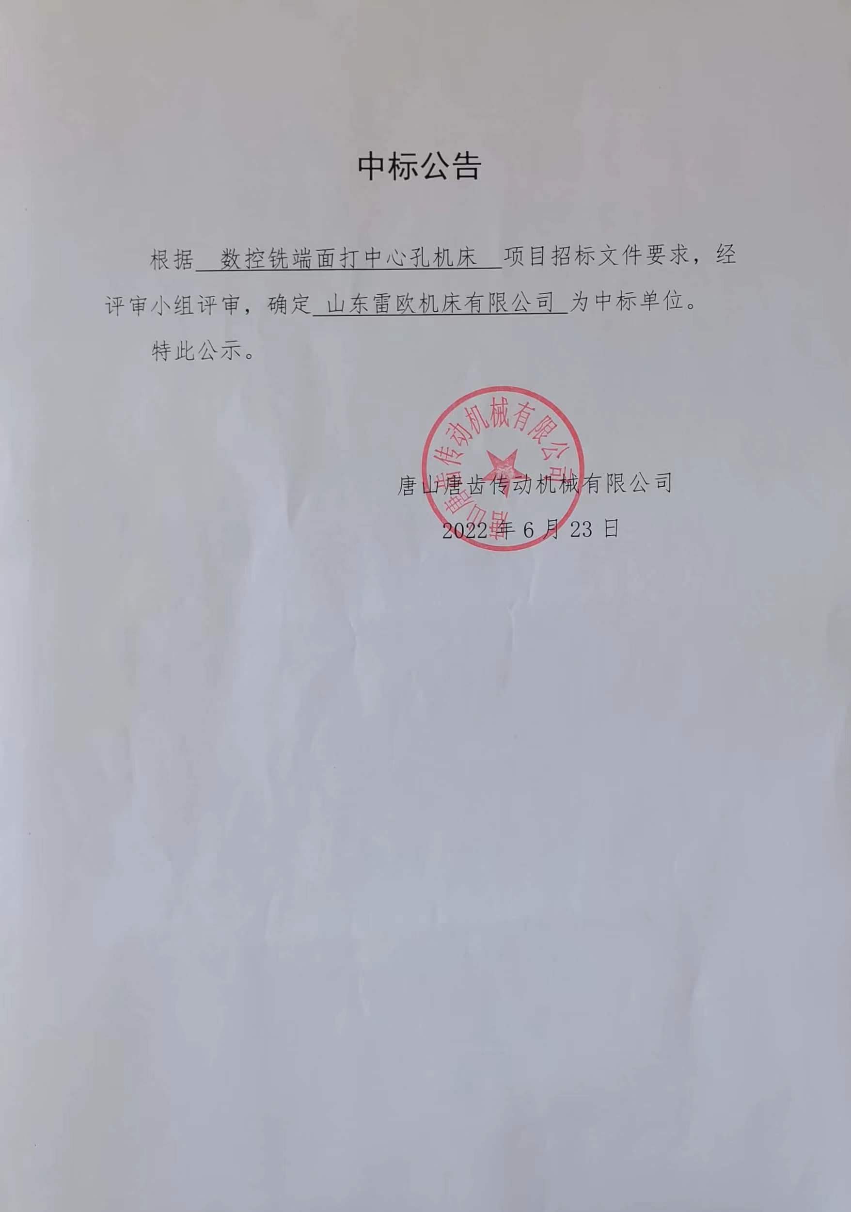 唐山唐齿传动机械有限公司数控铣端面打中心孔设备中标公告