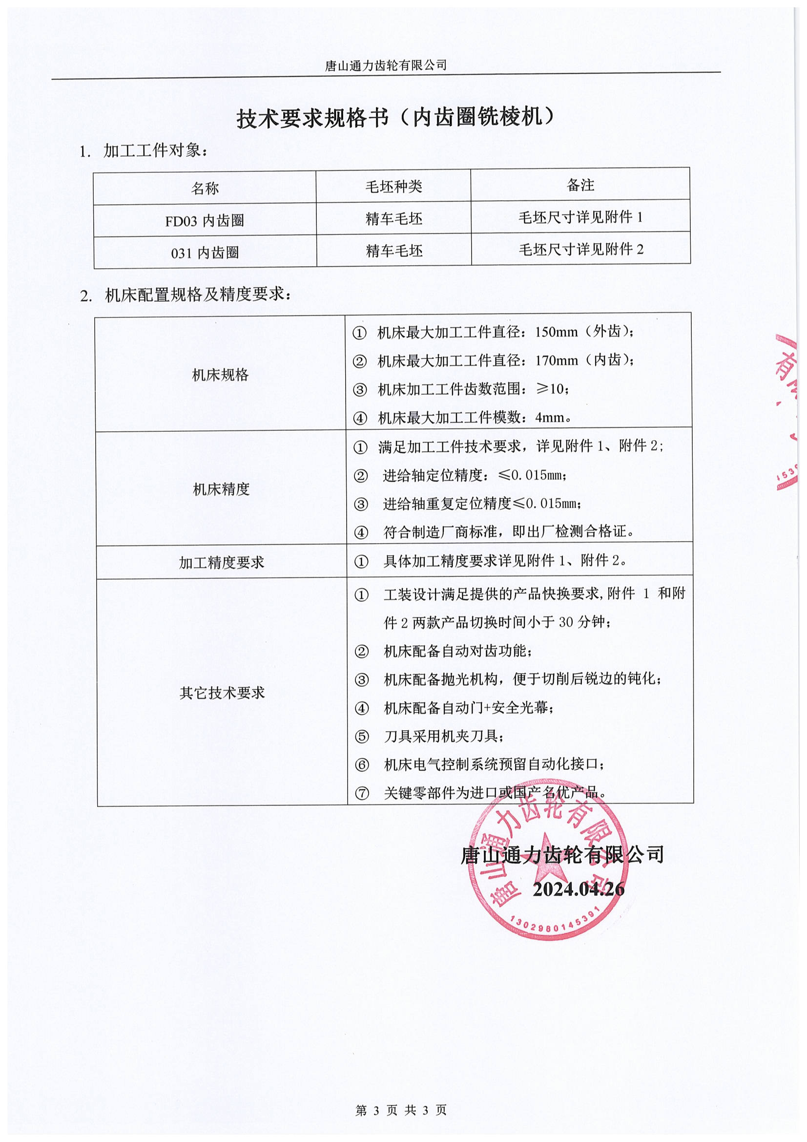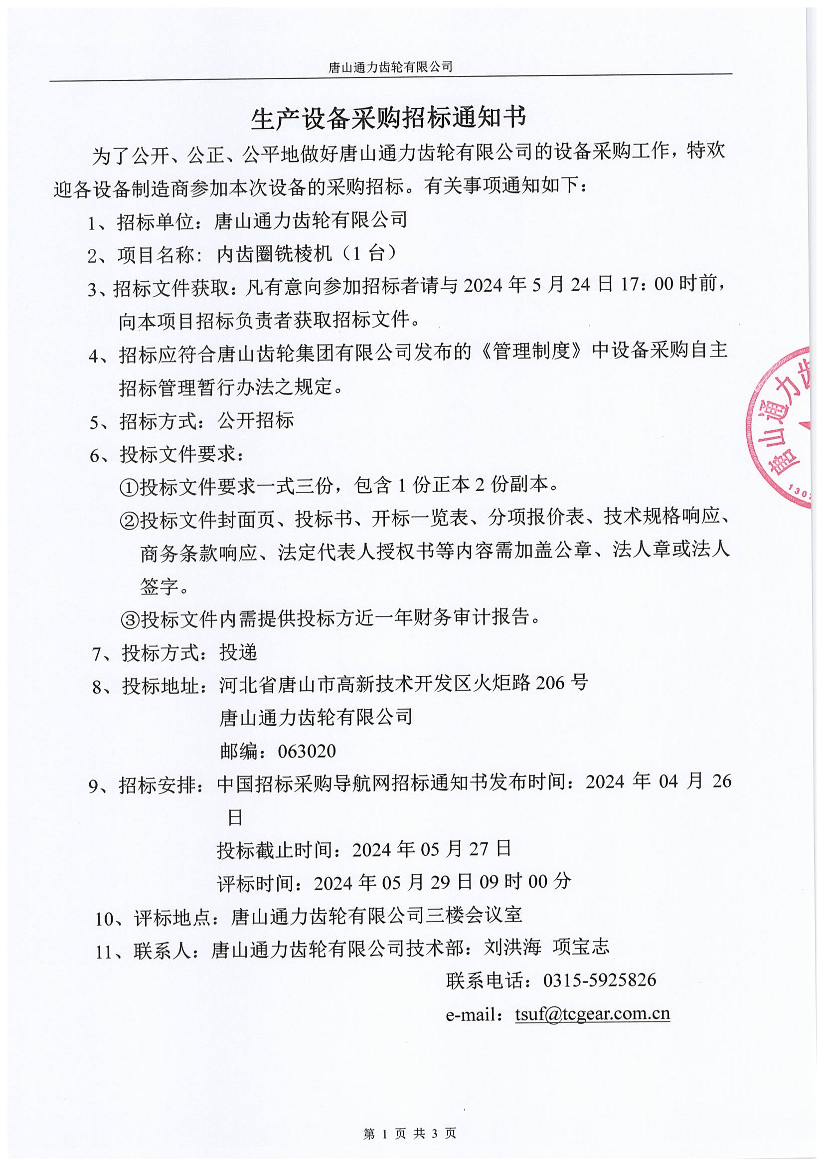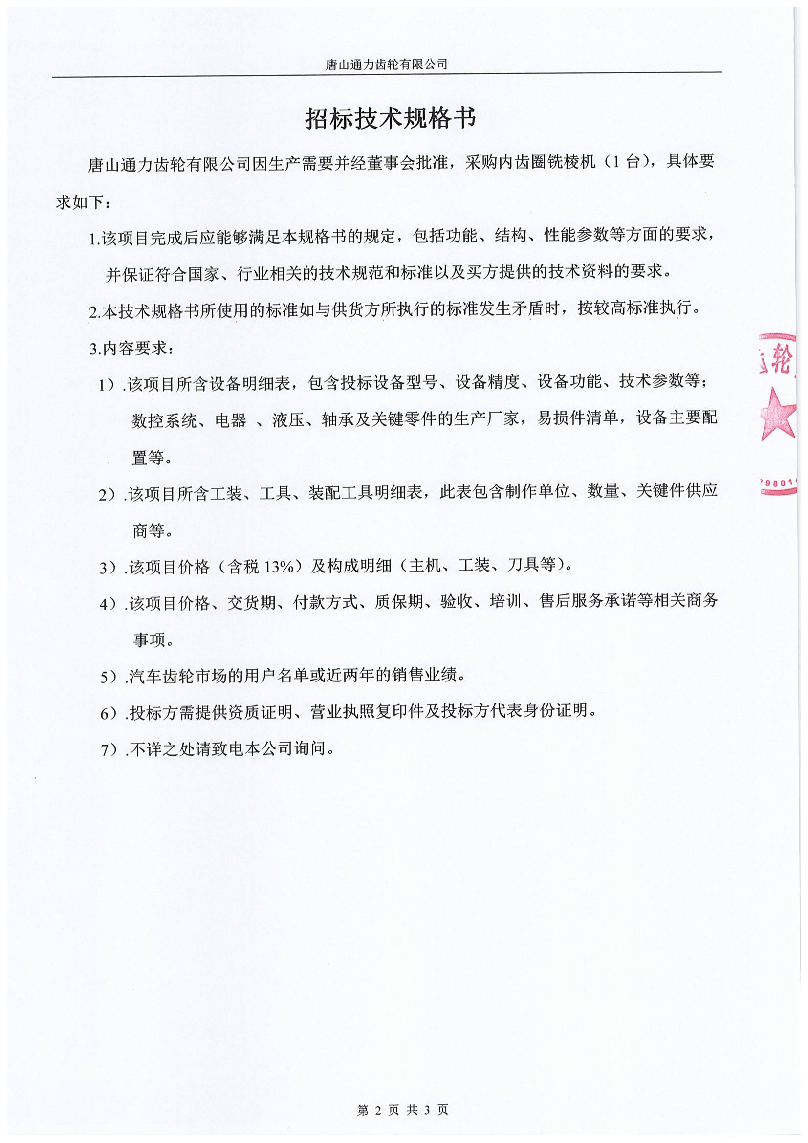 唐山通力齿轮公司内齿圈铳棱机( 1 台)采购招标通知