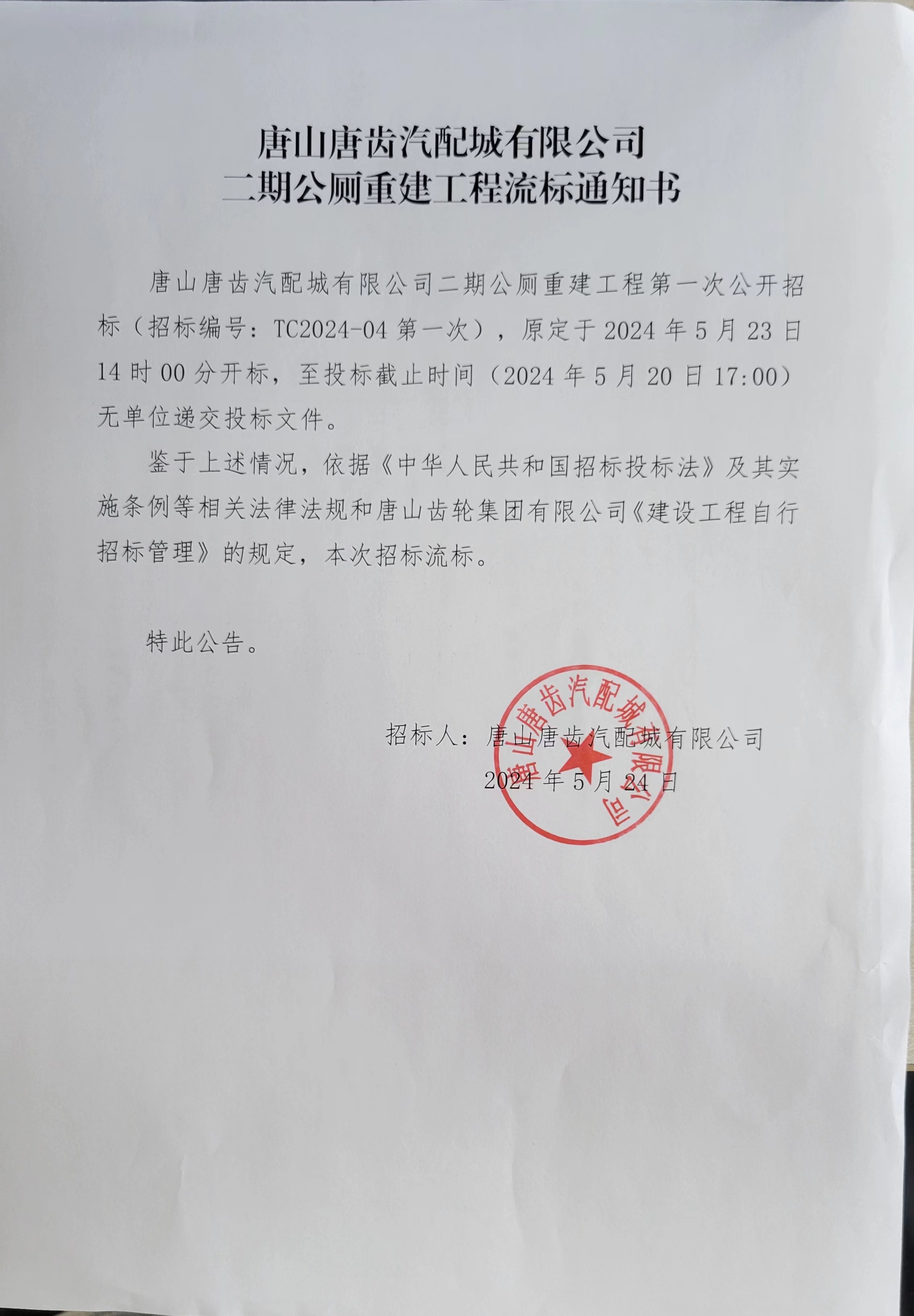 唐山唐齿汽配城有限公司二期公厕重建工程流标通知书