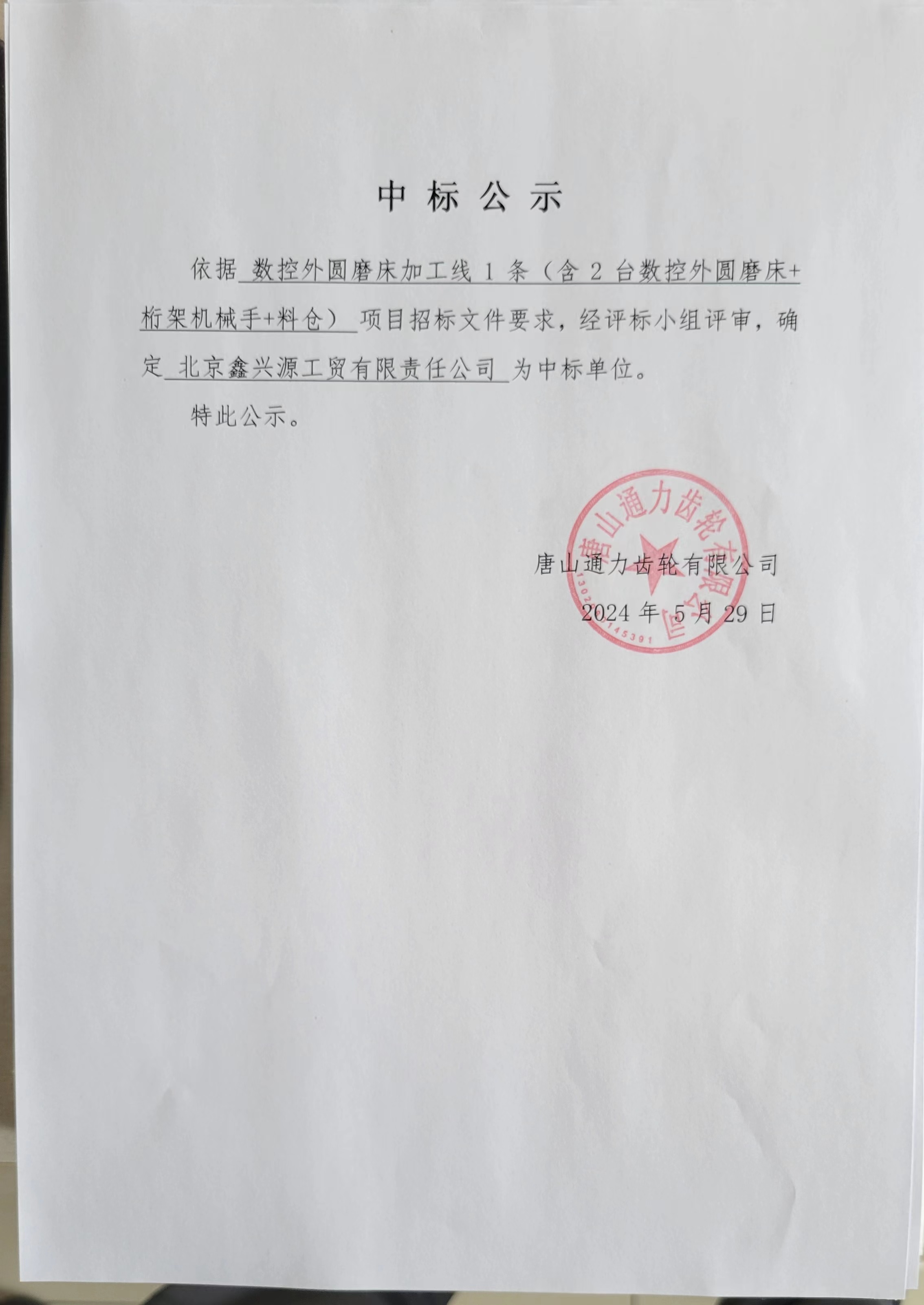 唐山通力齿轮有限公司数控外圆磨床加工线 1条中标公示