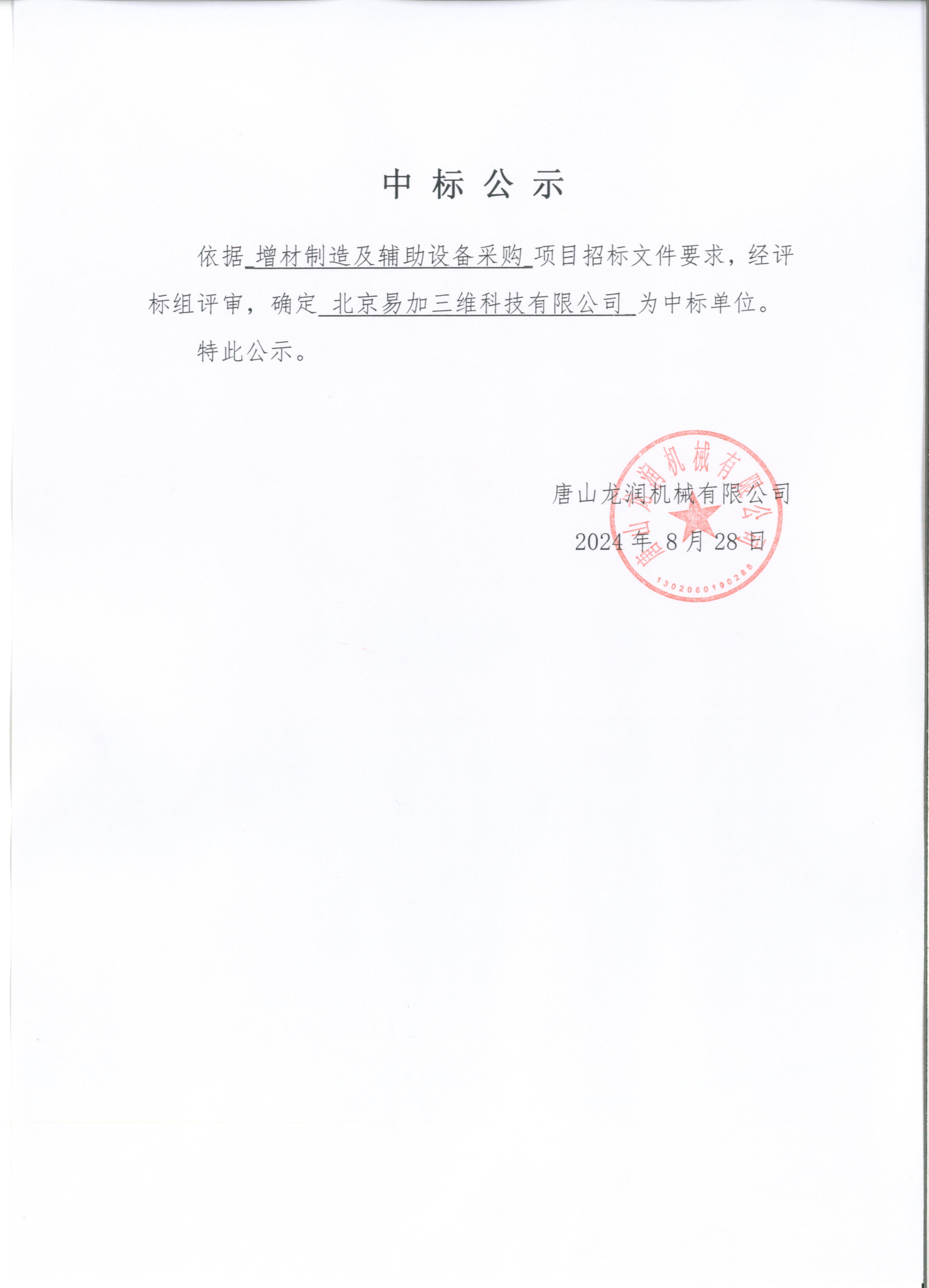 增材制造及辅助设备采购中标公告