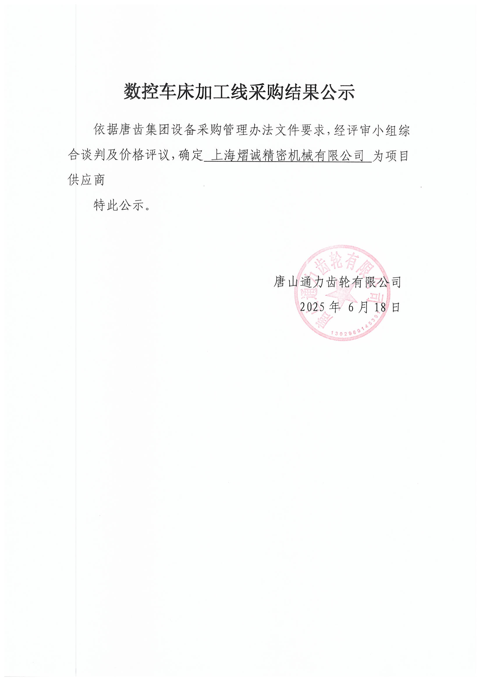 唐山通力齿轮有限公司数控车床加工线采购结果公示