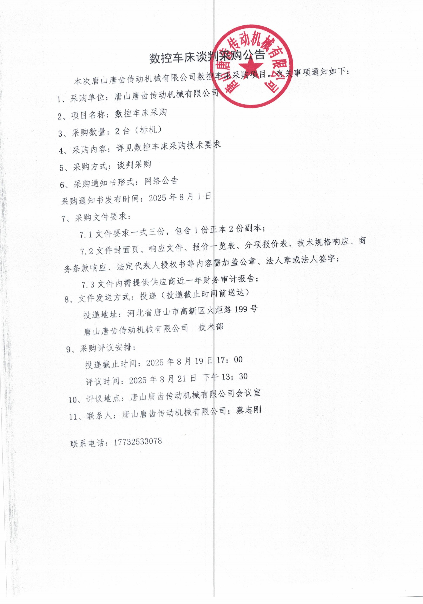 唐山唐齿传动机械有限公司 数控车床谈判采购公告