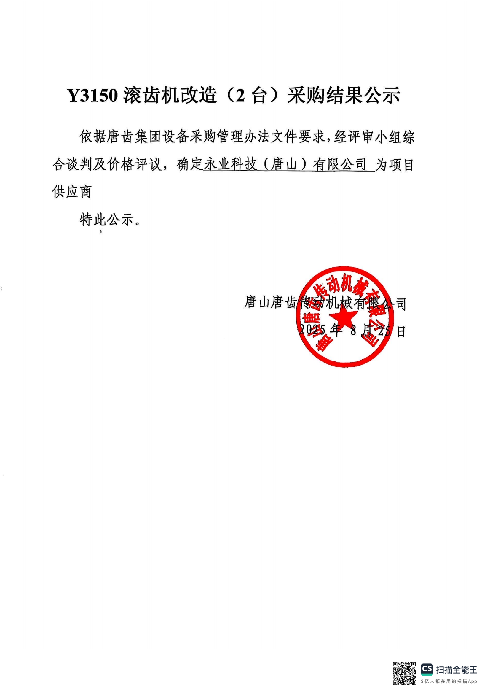 唐山传动齿轮机械有限公司 Y3150滚齿机改造(2台)采购结果公示