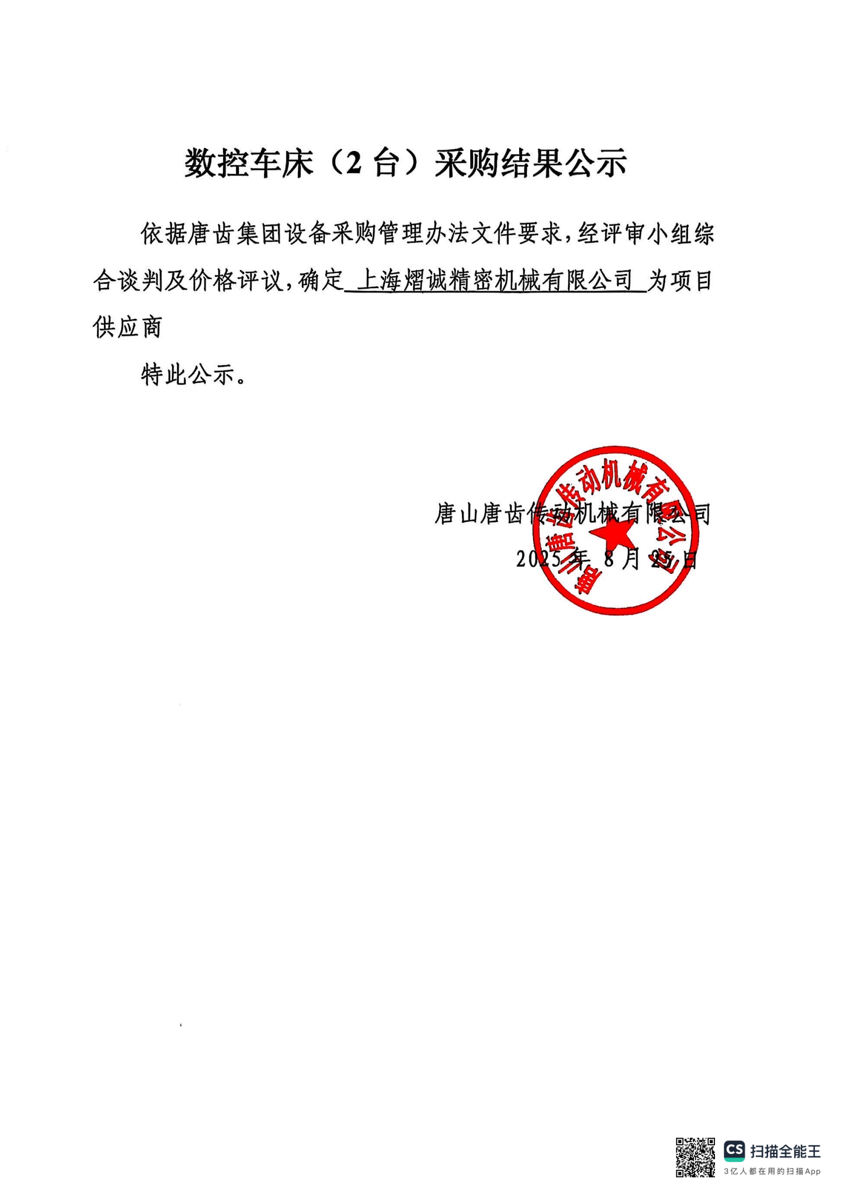 唐山传动齿轮机械有限公司 数控车床(2台)采购结果公示