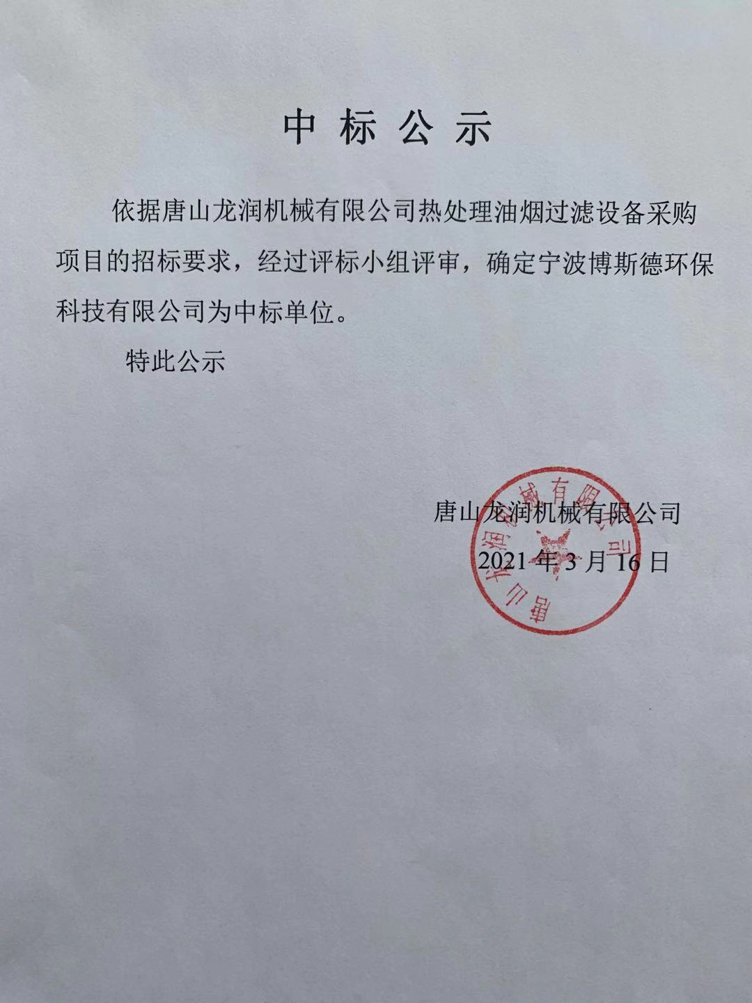 唐山龙润机械有限公司热处理油烟过滤设备采购项目中标公告